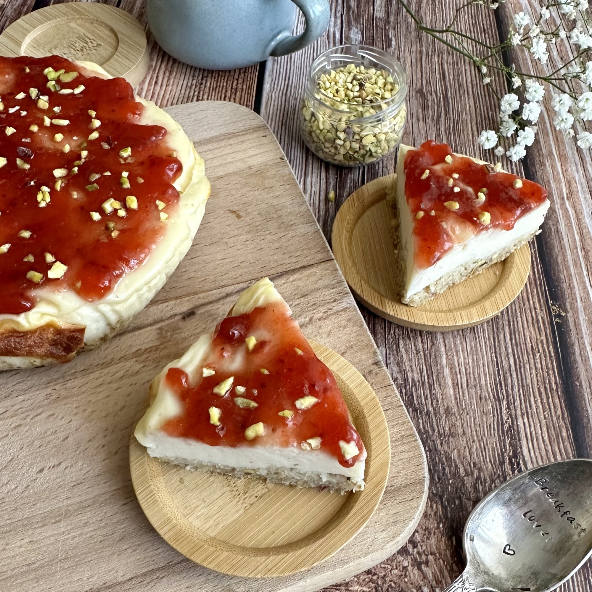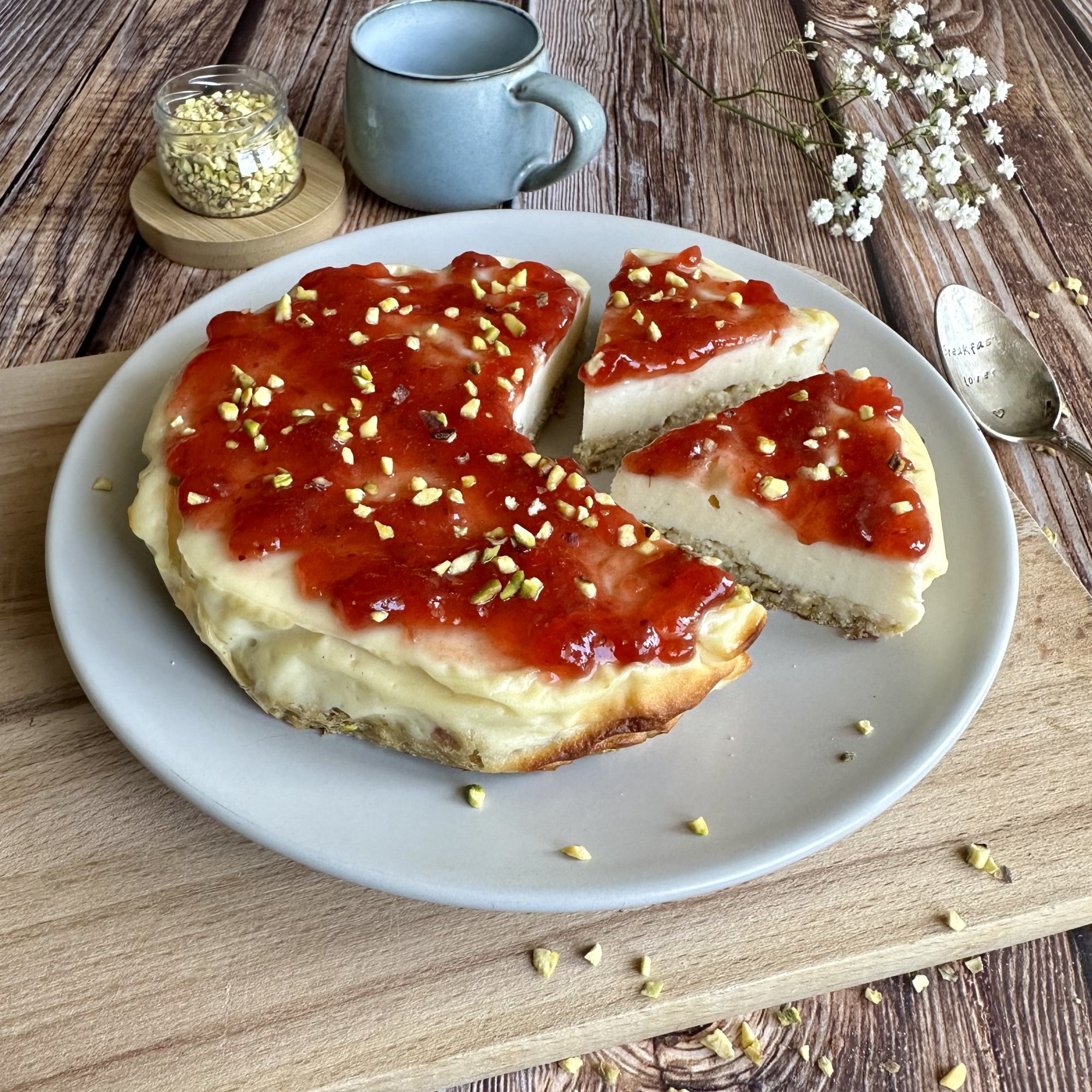 J’ai ajouté de la confiture de fraise et des éclats de pistache en topping !