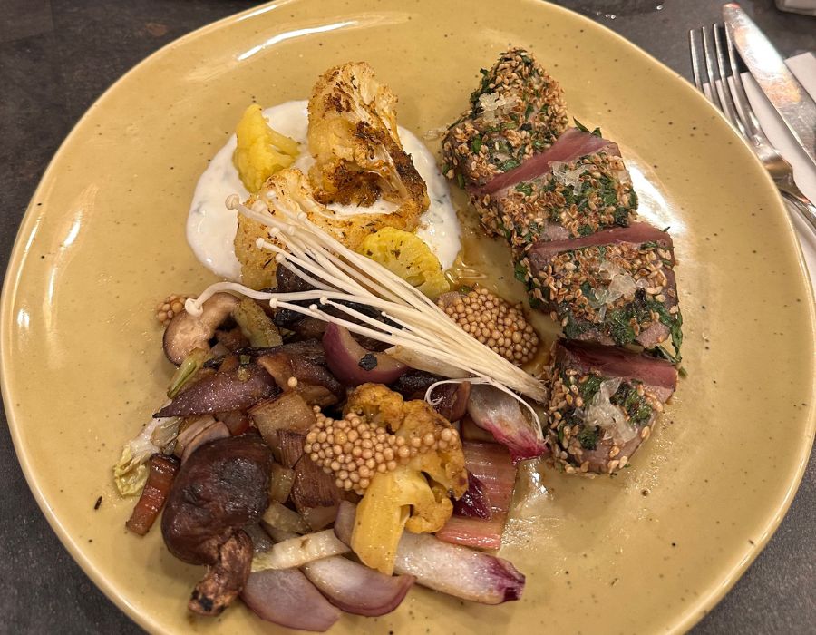 Pour le plat principal, les multiples saveurs sont également présentes ! Des assiettes présentées avec goût vous seront servies selon vos envies : salades de saison, tartare de boeuf ou daurade royale entière, tout le monde pourra trouver son bonheur ! Le prix des plats varient entre 17€ pour une salade jusqu’à 24€ pour une assiette de poisson, en fonction des plats de saison préparés par le cuisinier. De mon côté, j’avais pris un tataki de thon aux graines de sésame avec des légumes cuits au wok, c’était très bon et suffisant pour un repas le soir.