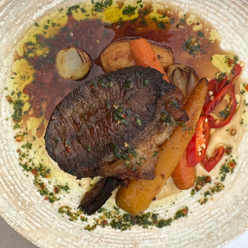 Du côté du plat principal, vous avez différents choix à base de poissons, de viande ou un plat pour les végétariens. La carte change régulièrement en fonction des produits de saison et des arrivages de la mer. J’ai beaucoup aimé la présentation des assiettes avec de jolies couleurs. Pour un plat à 24€ (avec des suppléments pour certains), nous avons choisi de goûter le merlu de ligne de la criée de Saint-Jean-de-Luz et le boeuf braisé en croute de thym citronné. Les saveurs étaient présentes et les assiettes sortaient des habitudes que nous avons, nous avons beaucoup aimé.