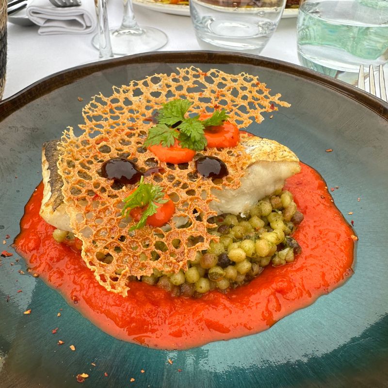Nous n’avons pas pris d’entrées ce jour-là, mais le restaurant nous a offert une petite mise en bouche : du poulpe aux légumes avec une tuile à l’encre. C’était très bon et nous avons vraiment apprécié cette ouverture du repas offerte par le restaurant à tous ses clients. .