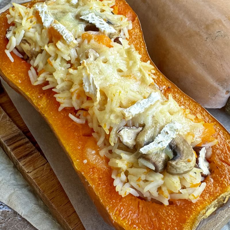 Aujourd’hui, on troque les légumes d’été farcis par une recette toute simple de butternut farcie au riz et au brie de Meaux. Le brie apporte du caractère à la courge et permet de gratiner la farce à base de riz.