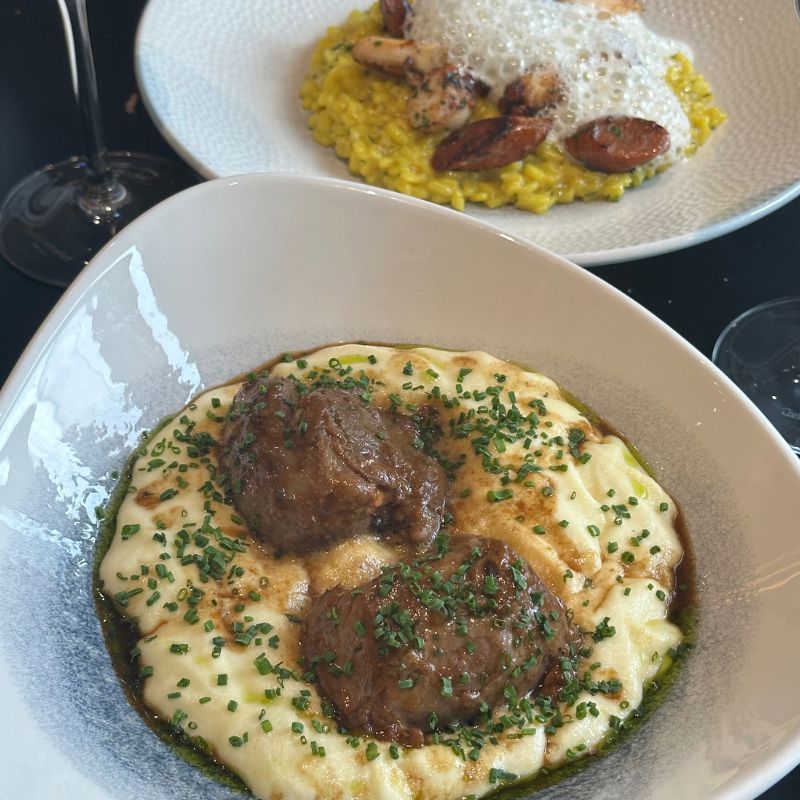 Pour le plat, j’ai goûté le riz pilaf aux épices paella, poulpe grillé et saucisse Txistorra ainsi que les joues de cochon avec la mousseline de gratin dauphinois et la fondue de poireaux. Les joues étaient bien cuites, la viande était tendre comme j’aime et le jus de viande vient sublimer l’assiette à la dégustation. Pour le riz pilaf, il me rappelait les saveurs de la paella, même si pour moi l’assiette manque un peu de générosité. Les plats coûtent entre 18€ et 25€.