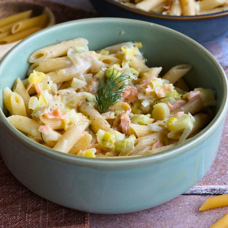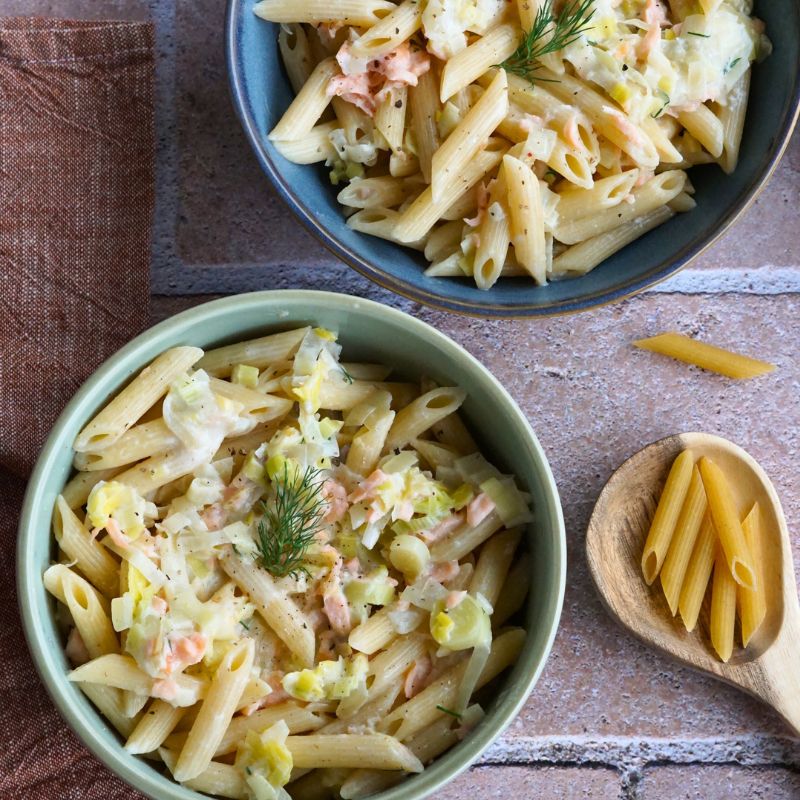 Voici une recette réalisée avec des penne et l’association du saumon et du poireau qui fonctionne à merveille. Côté sauce, le plat est accompagné d’une crème fraîche à l’aneth.