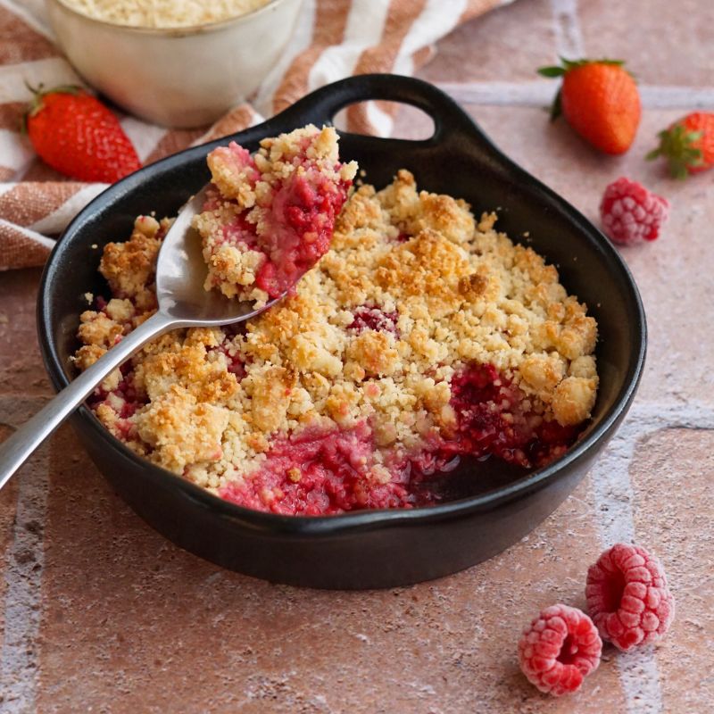 Aujourd’hui je te partage ma recette de crumble sans beurre et bien équilibrée pour se faire plaisir. J’ai choisi de le faire aux framboises pour le retour des beaux jours. J’ai utilisé des framboises surgelées, pour toujours pouvoir se faire un petit crumble à la dernière minute !