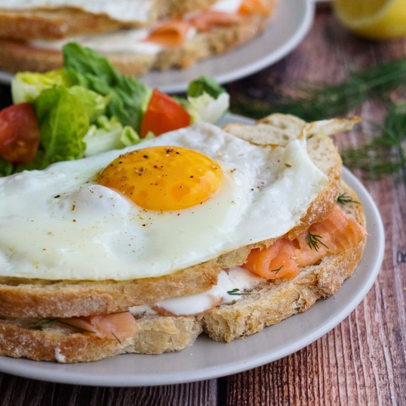 Tout le monde connait le croque monsieur, mais est-ce que vous avez déjà goûté au croque madame ? C’est tout simplement un croque monsieur avec un oeuf au plat dessous, c’est encore plus gourmand ! Aujourd’hui je vous partage une recette au saumon fumé avec une sauce citronnée et à l’aneth. C’est frais et gourmand pour l’été.