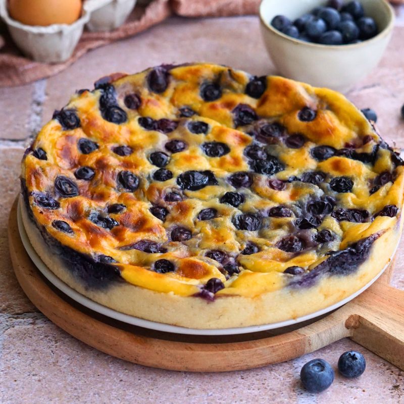- Verser l’appareil à flan dans un moule et ajouter par-dessus les myrtilles.