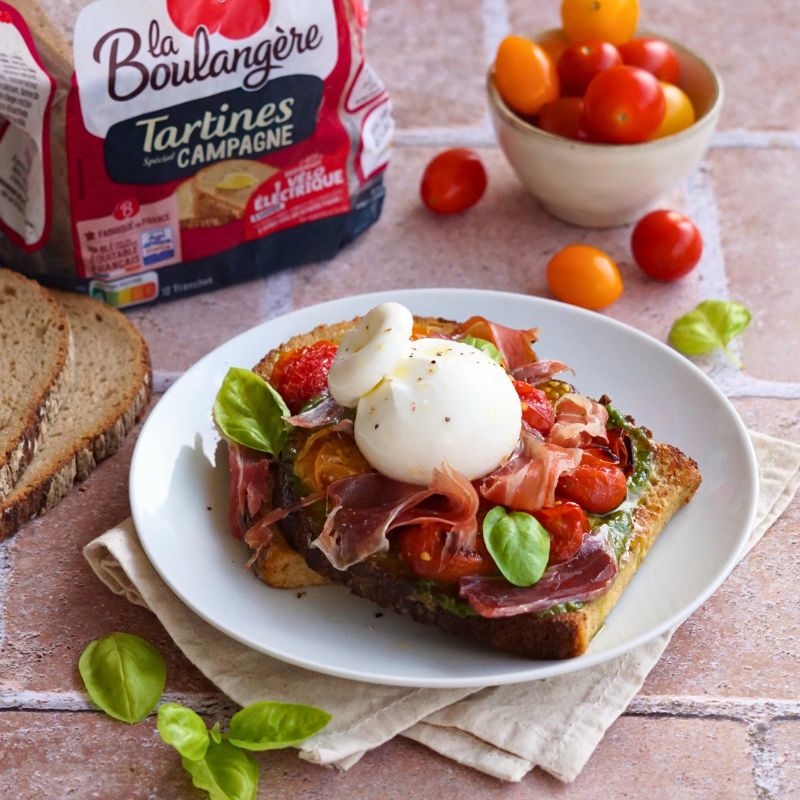 Pour le pain, j’ai choisi les Tartines spécial Campagne de La Boulangère fabriquées avec des farines de blé issu du commerce équitable français, de seigle et d’orge malté. Il est idéal pour cette recette avec sa mie fondante et son bon goût de pain de campagne. Ils ont d’ailleurs toute une gamme de pains céréaliers conçue pour tous les moments de la journée à base de farine de maïs, d’épeautre ou encore d’avoine.