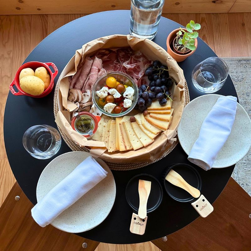 Pour le soir, nous avions choisi la box raclette, avec le poêle à bois allumé pour se mettre dans l’ambiance ! Comme pour le petit déjeuner, la box est préparée par l’équipe avec des produits locaux et de saison pour mettre en lumière les petits producteurs du coin. Nous avons eu suffisamment à manger pour les 2 gros mangeurs que nous sommes et ce fut un régal de la réaliser avec de bons produits (de la cabane on voit même la fromagerie !).