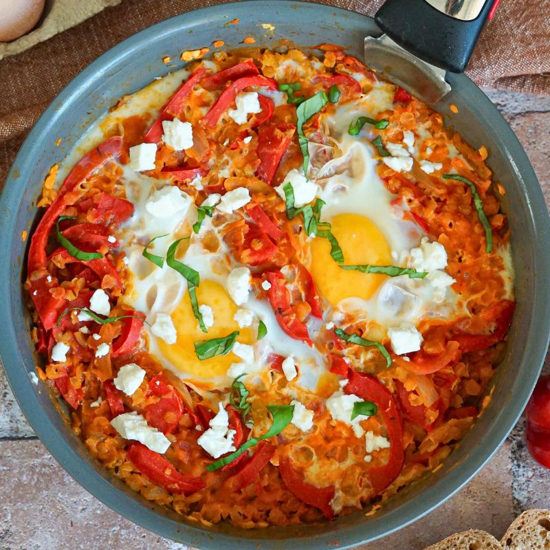 Quand j’ai envie de bien manger sans passer 2h en cuisine et que je suis solo à l’appart, je me fais cette chakchouka aux lentilles corail. Ici j’ai réalisé une version avec des poivrons mais je la décline avec les légumes de saison pour pouvoir en manger toute l’année.