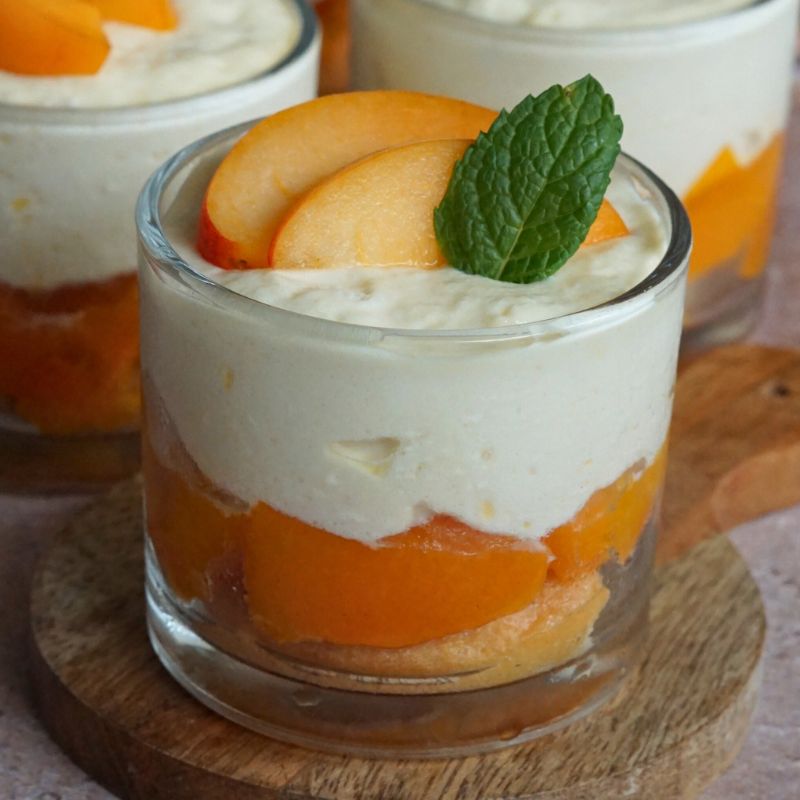 - Monter les verrines : biscuit imbibé dans le jus d’abricots, abricots rôtis puis crème.