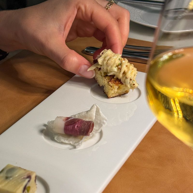 Le dîner débute par trois amuse-bouches raffinés avec une mention spéciale au nougat au camembert, absolument addictif et à ne surtout pas manquer.