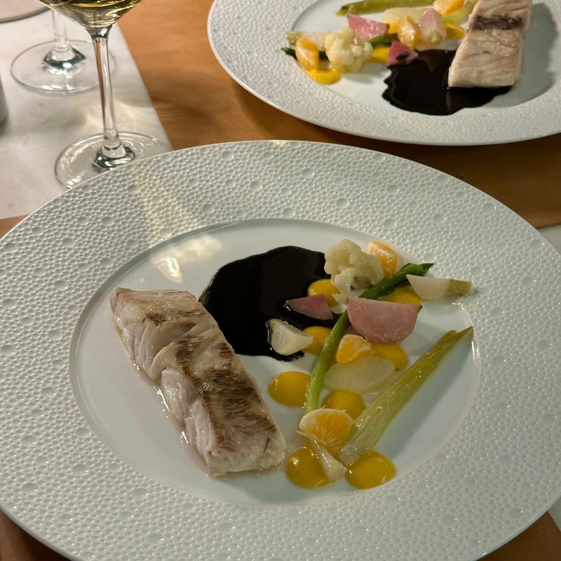 Pour le plat chaud, le maigre est proposé avec des légumes d’automne et une sauce à l’encre de seiche. La cuisson du poisson est maîtrisée, il est fondant en bouche, et la sauce crée un lien subtil entre les légumes et le poisson.