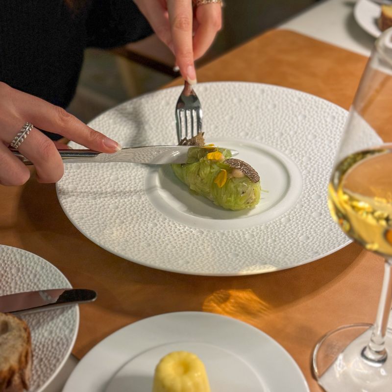 La première entrée joue la carte de l’élégance et de l’équilibre. Le poireau est sublimé par la truffe sans jamais être éclipsé. Le citron caviar vient apporter une touche de fraîcheur parfaitement maîtrisée. Une assiette tout en finesse.