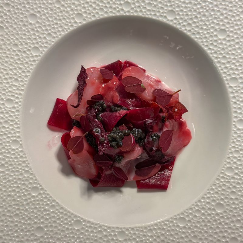 Servie en carpaccio à la betterave, accompagnée de tagliatelles de betterave et de grenade, cette assiette monochrome est magnifiée par du caviar girondin. Le croquant de la betterave contraste délicatement avec la douceur des noix de Saint-Jacques.