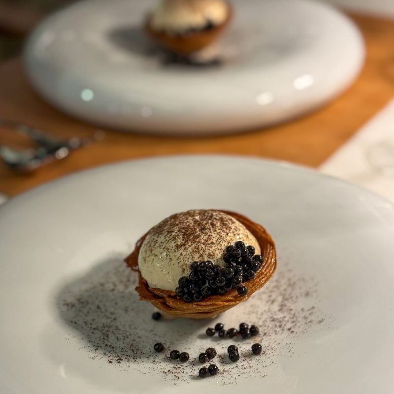 Pour conclure ce repas, le Chef pâtissier Clément Tilly met la vanille à l’honneur. Le dessert se compose d’un feuilletage caramélisé, d’une glace vanille et d’un caviar de vanille réalisé maison. Un dessert frais, équilibré, où la vanille s’exprime pleinement sans jamais lasser.